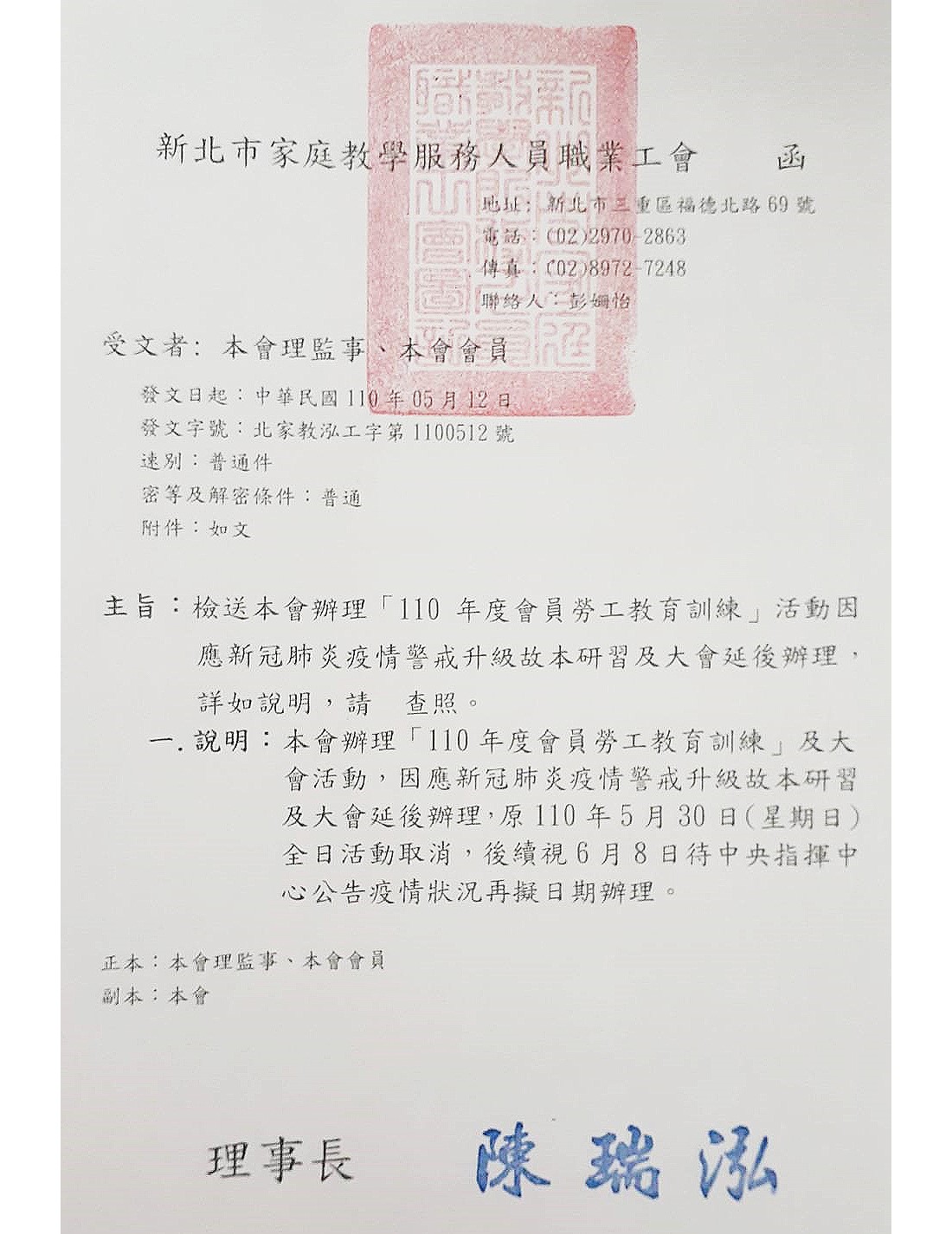 110年度會員勞工教育訓練及大會活動因應疫情警戒升級延後辦理